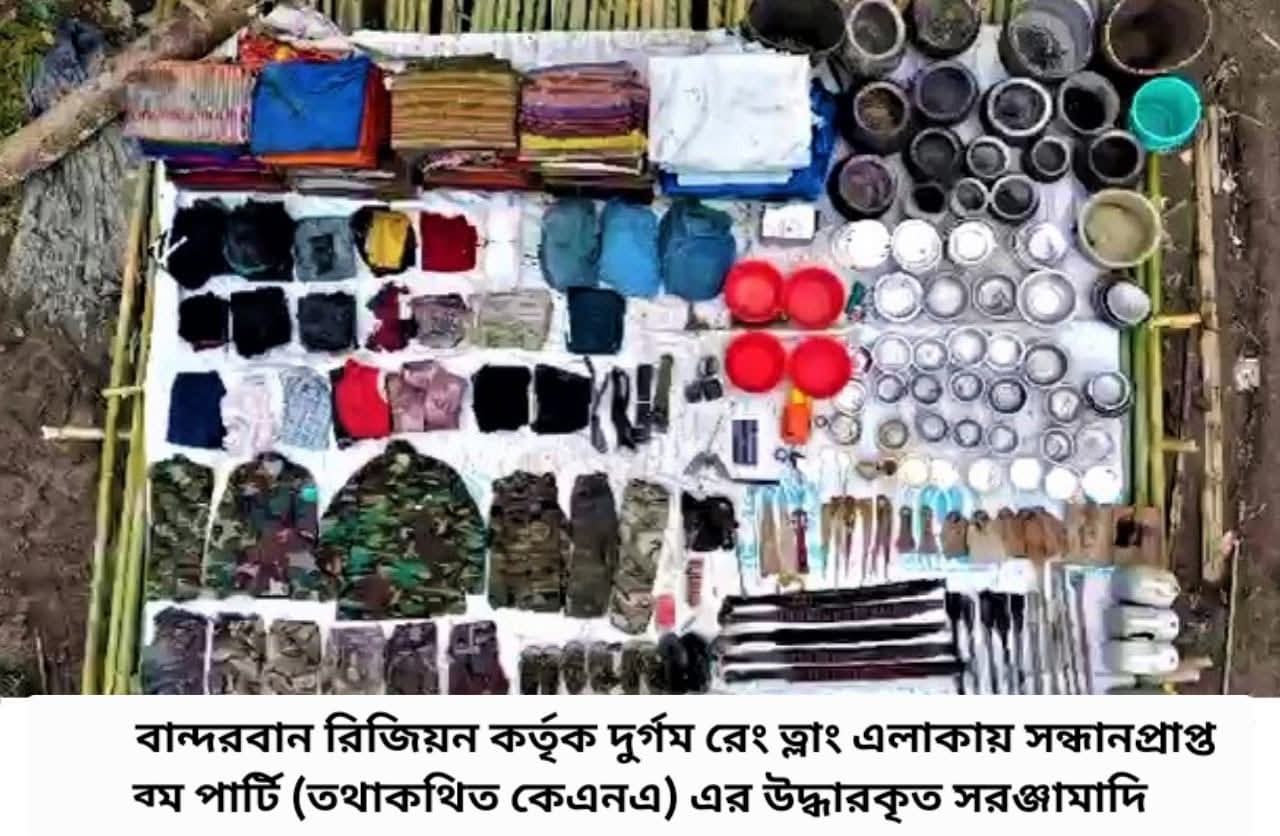 অভিযানকালে প্রশিক্ষণের জন্য ব্যবহৃত কাঠের রাইফেল, স্নাইপার অস্ত্রের সিলিং, মিলিটারি বেল্ট, কার্তুজ বেল্ট, পোচ, ইউনিফর্ম, বুট, কম্বল, ওয়াকিটকি চার্জার, সোলার প্যানেল, রসদ ও বিভিন্ন সরঞ্জাম জব্দ করা হয়।